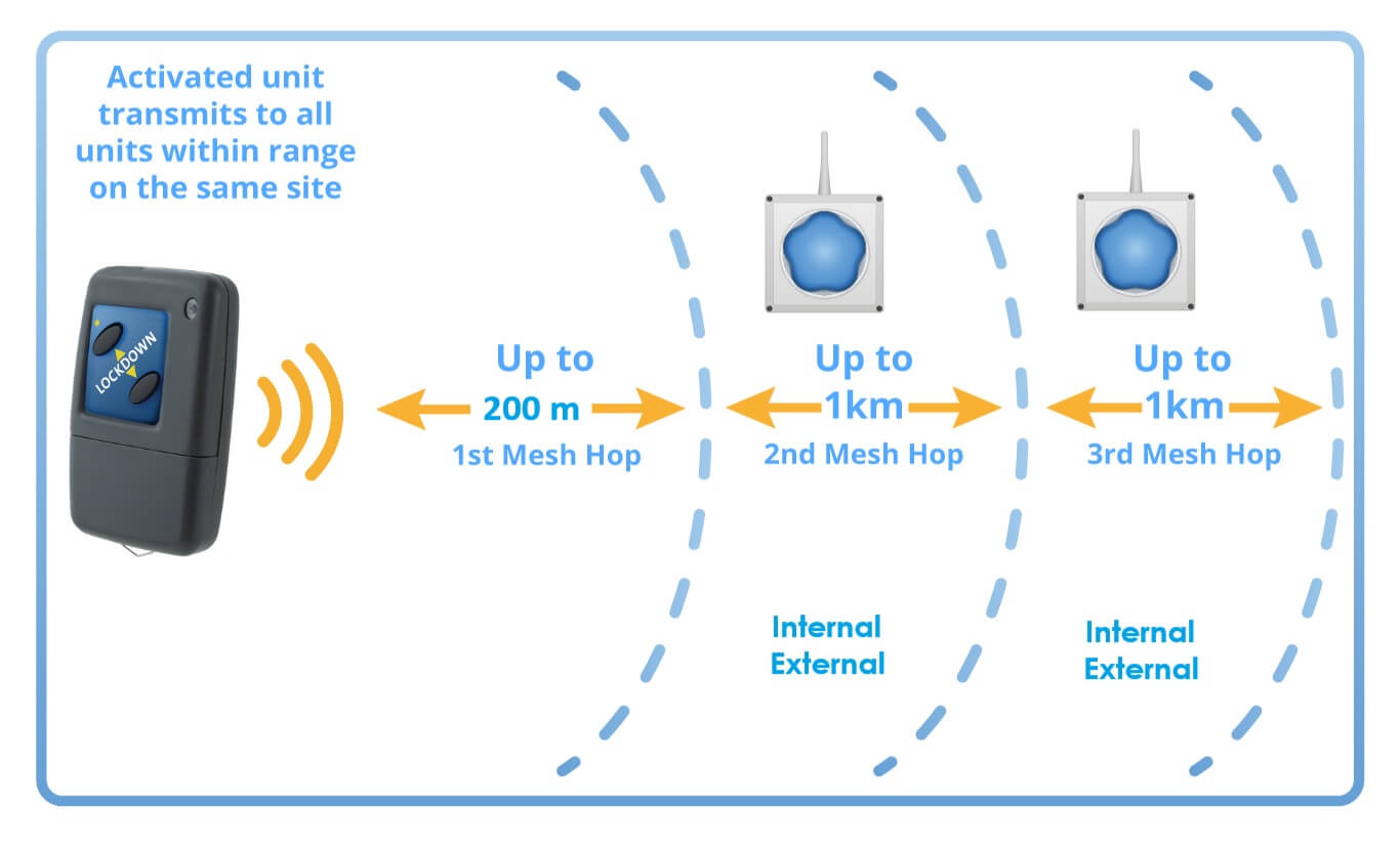 This compact remote trigger allows designated staff to raise a full wireless lockdown alarm from anywhere on site,